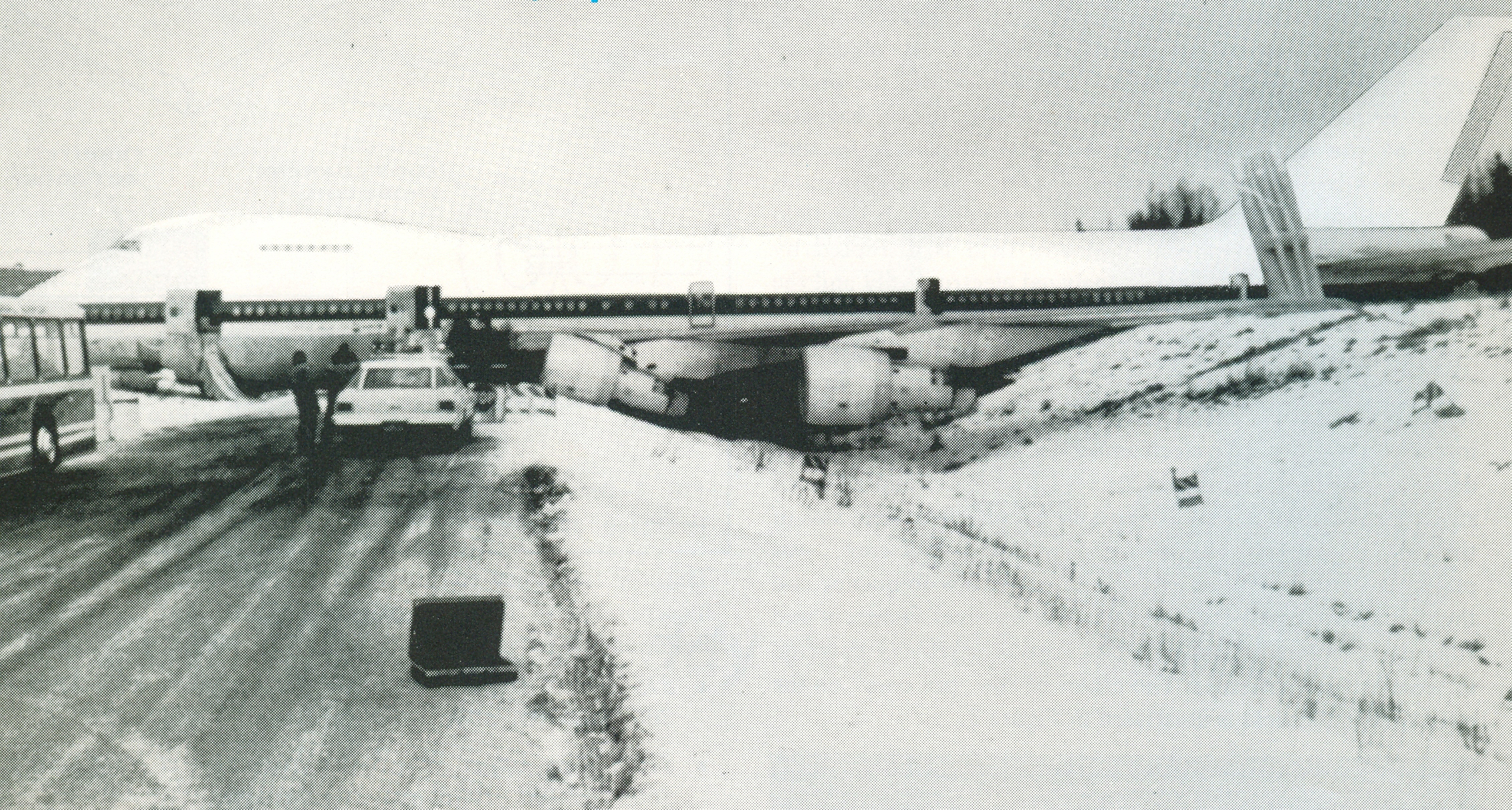 In December 1975 Japan airline had an accident at Anchorage Alaska. A 747 airplane was scheduled to take off for Tokyo, the weather was bad. It was windy and the taxi ways were covered with ice.
