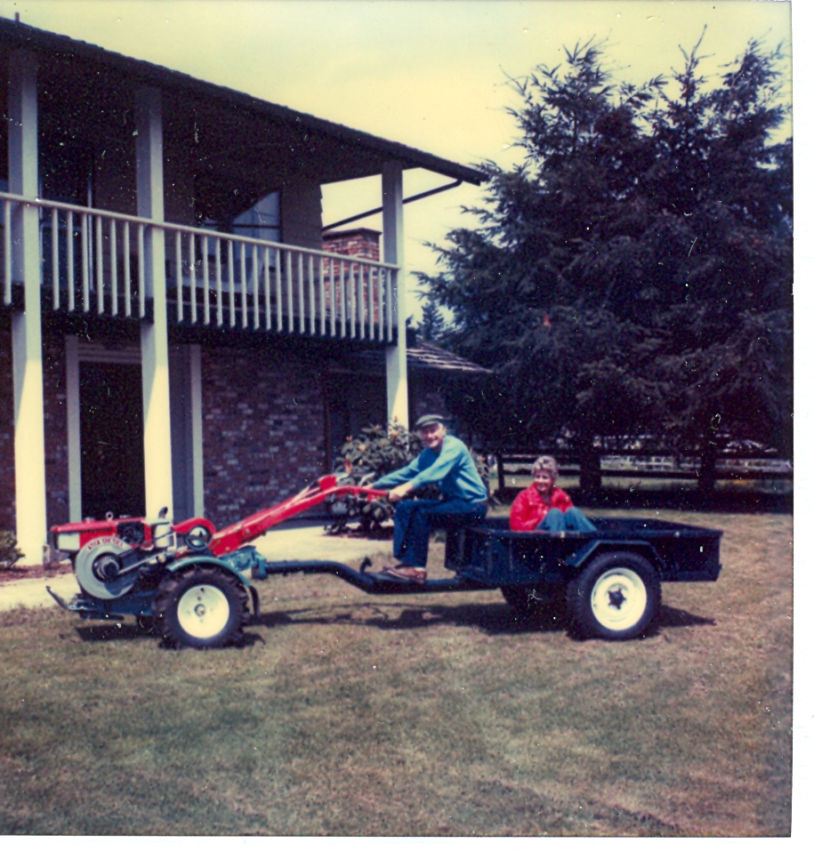The plow could be converted to a tractor and came with a garden cart. So I had fun driving it up and down our street with people in the cart. I hauled wife Ruth, neighbor lady Janet Wainwright, and son Doug at one time or another. Not all at the same time.